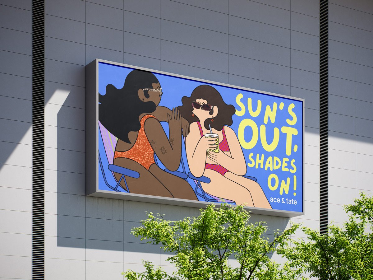 A self-initiated brief for Ace&Tate, for a summer campaign I created “Sun’s Out, Shades On!”. For this campaign, I designed a shop front layout, to be applied with vinyl sticker, posters for billboards, a printed catalogue cover, paper bags and merchandise.